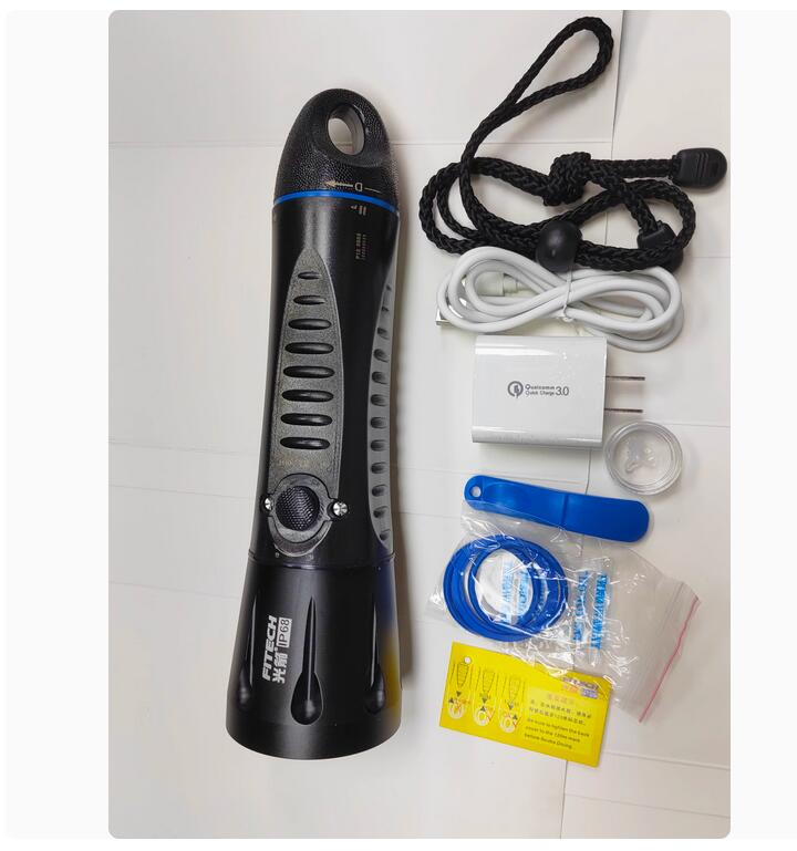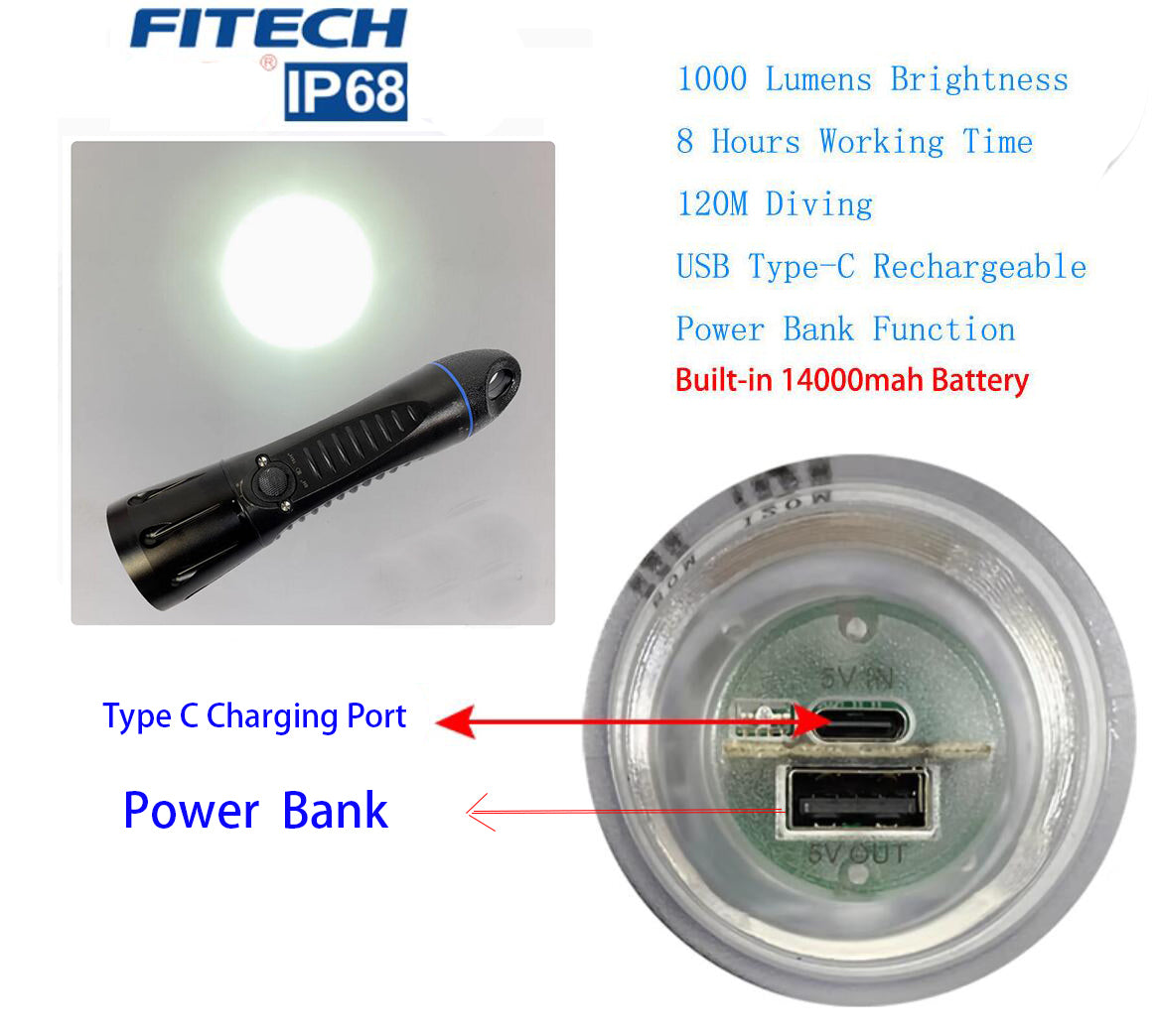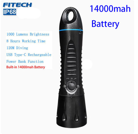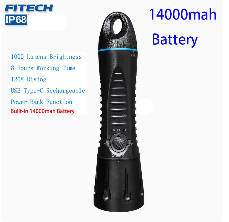 Fitech F13 Scuba Diving Light Built-in 14000mah Battery Flashlight USB C Rechargeable 1000 Lumen LED Waterproof Torch -Black
