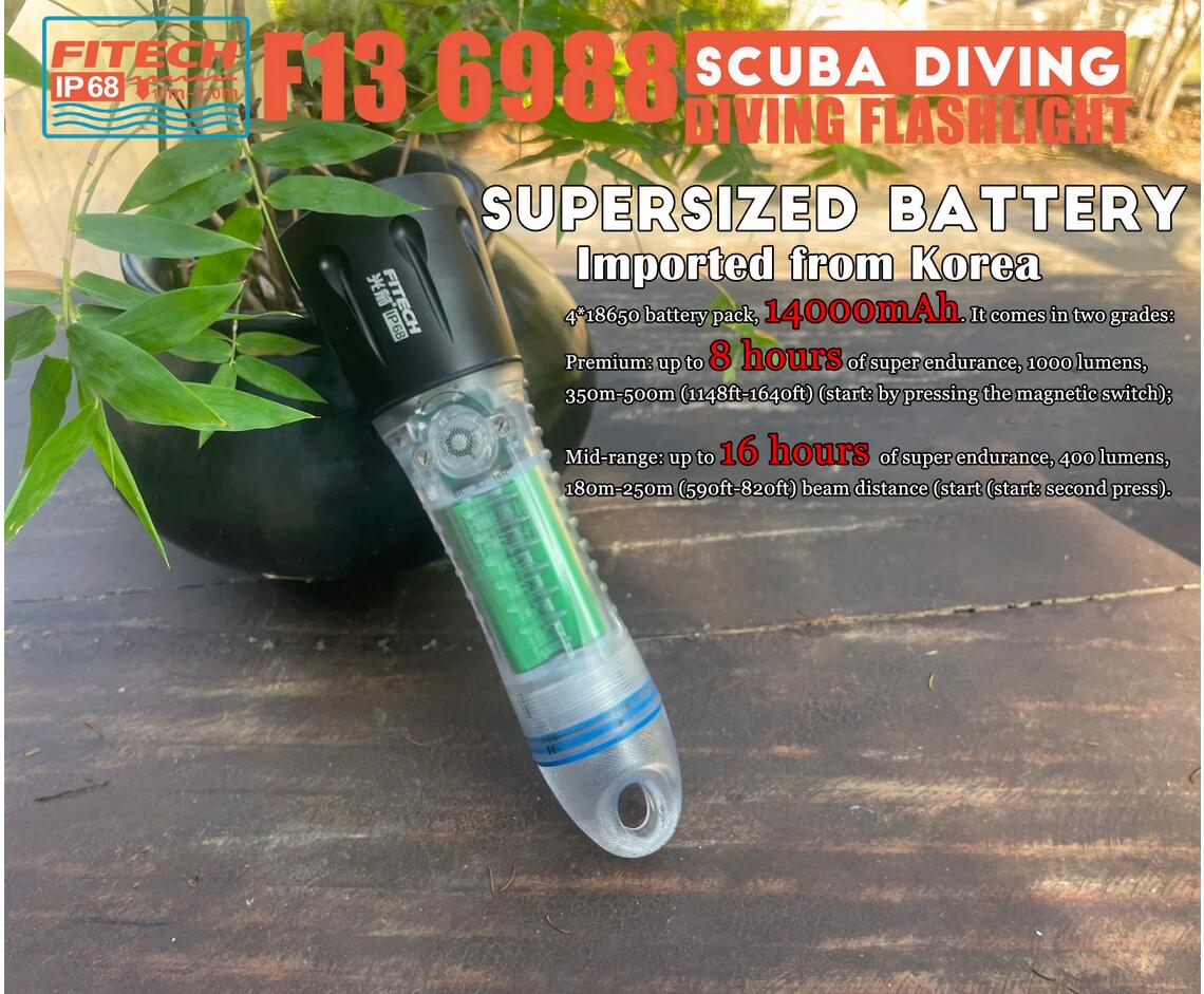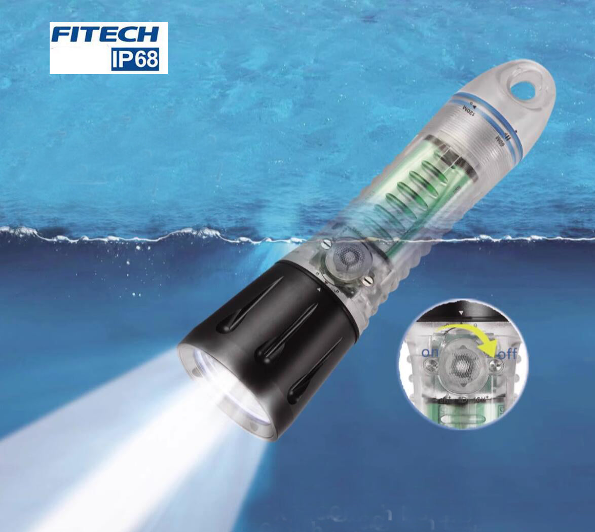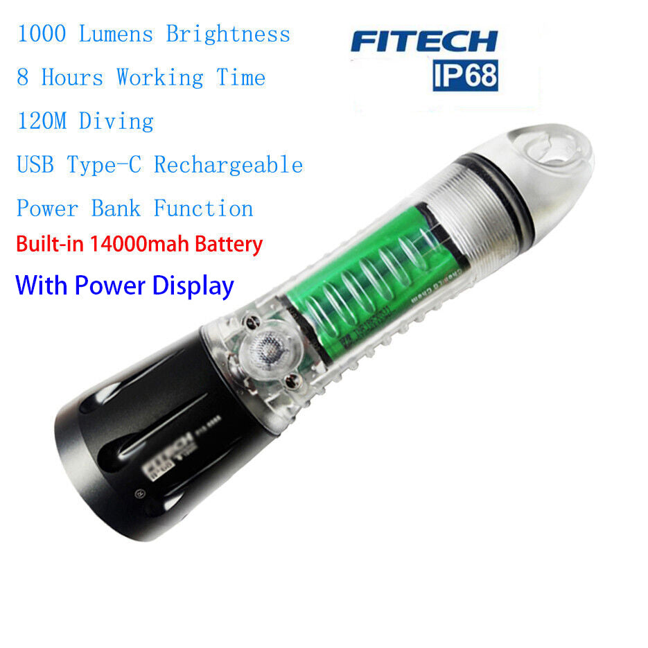 Fitech F13 Scuba Diving Light Built-in 14000mah Battery Flashlight USB C Rechargeable 1000 Lumen LED Waterproof Torch -Transparent