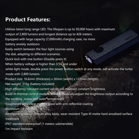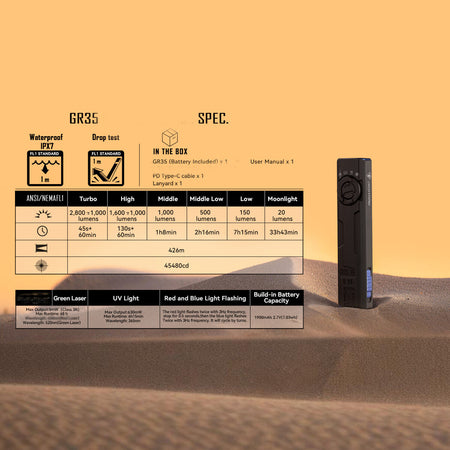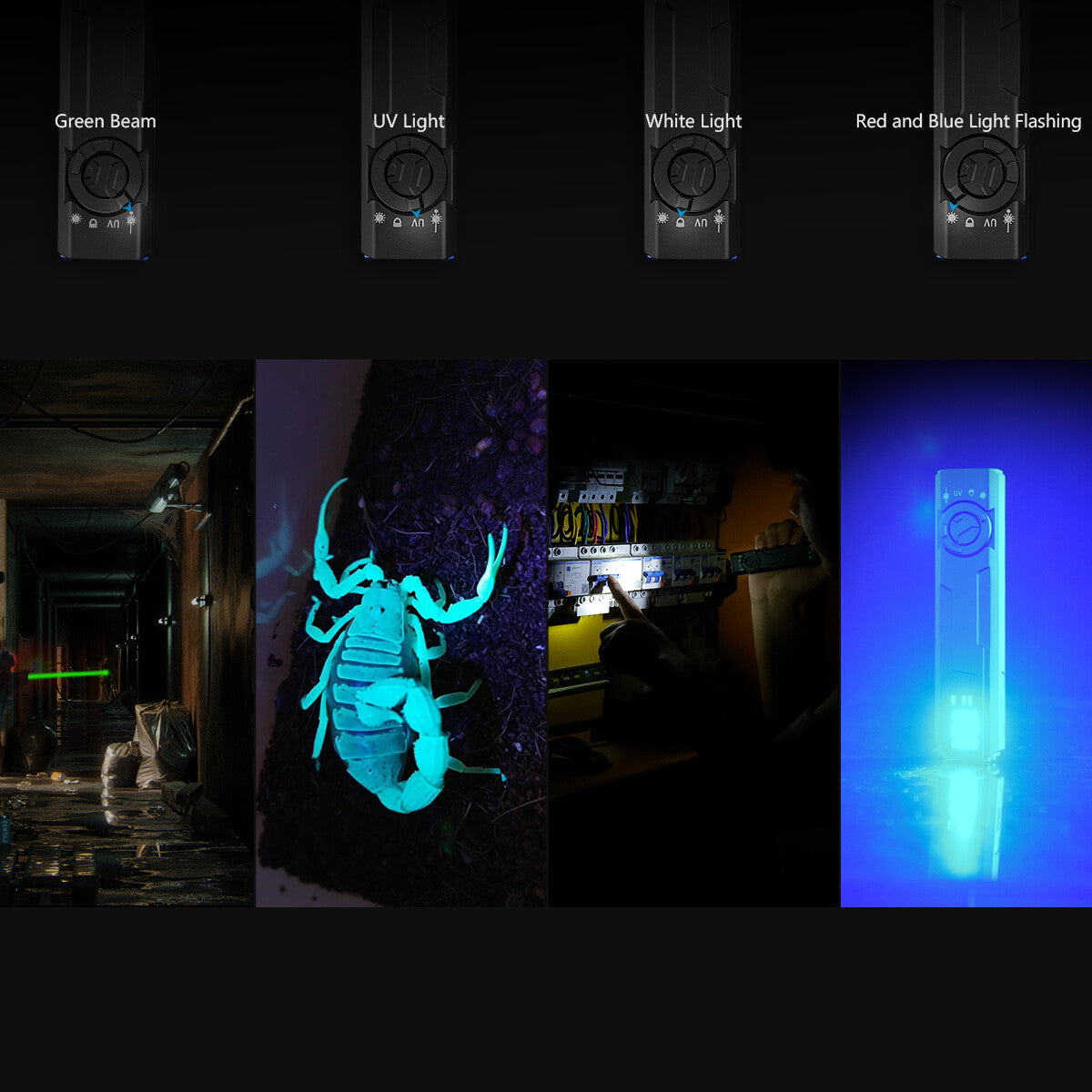 The Imalent GR35 flashlight is a great all-purpose work light. A single switch allows you to choose between four light sources, six brightness levels of a bright white light and strobe. It is a truly innovative EDC flashlight that meets your demands for brighter, smarter, and more versatile lighting. With a powerful 2,800 lumens output and six brightness level, it offers versatility for any situation. Its compact size makes it easy to carry, while the redlaser and red and blue flash adds extra functionality. Plus,with a UV light for insect tracking, phosphore scence activation, and banknote verification, it's perfect for outdoor adventures and everyday use. With a 1,900mAh battery providing up to 36 hours of battery life, it's the perfect companion for all your lighting needs. Magnets on the tail let you attach the light to most metal surfaces for hands-free lighting. The sturdy clip allows you to attach the light to your belt, pocket or pack. Quality built with an IPX7 rated dust proof and heavy rain resistant, the Imalent GR35 Rechargeable Magnetic Flashlight will be your trusted tool in the field or on the job.