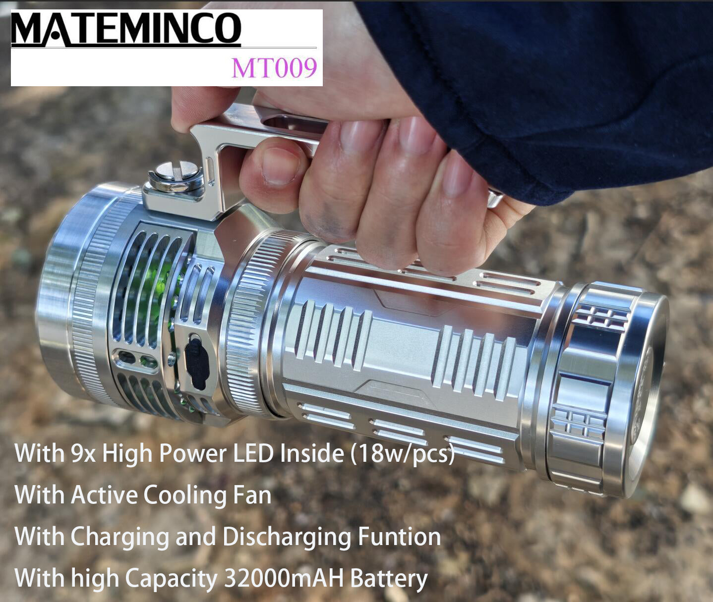 Mateminco High Power Silver Rechargeable Flashlight 26000Lumen Torch With Active Cooling Fan/ 9x LED/32000mAh Battery/Power Bank Funtion