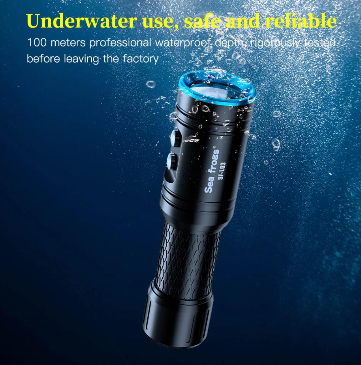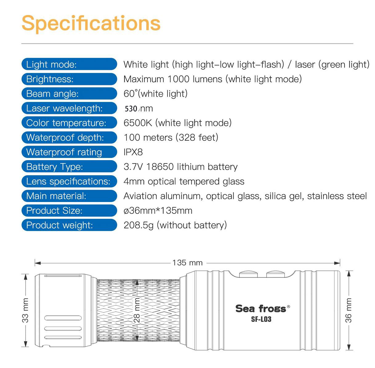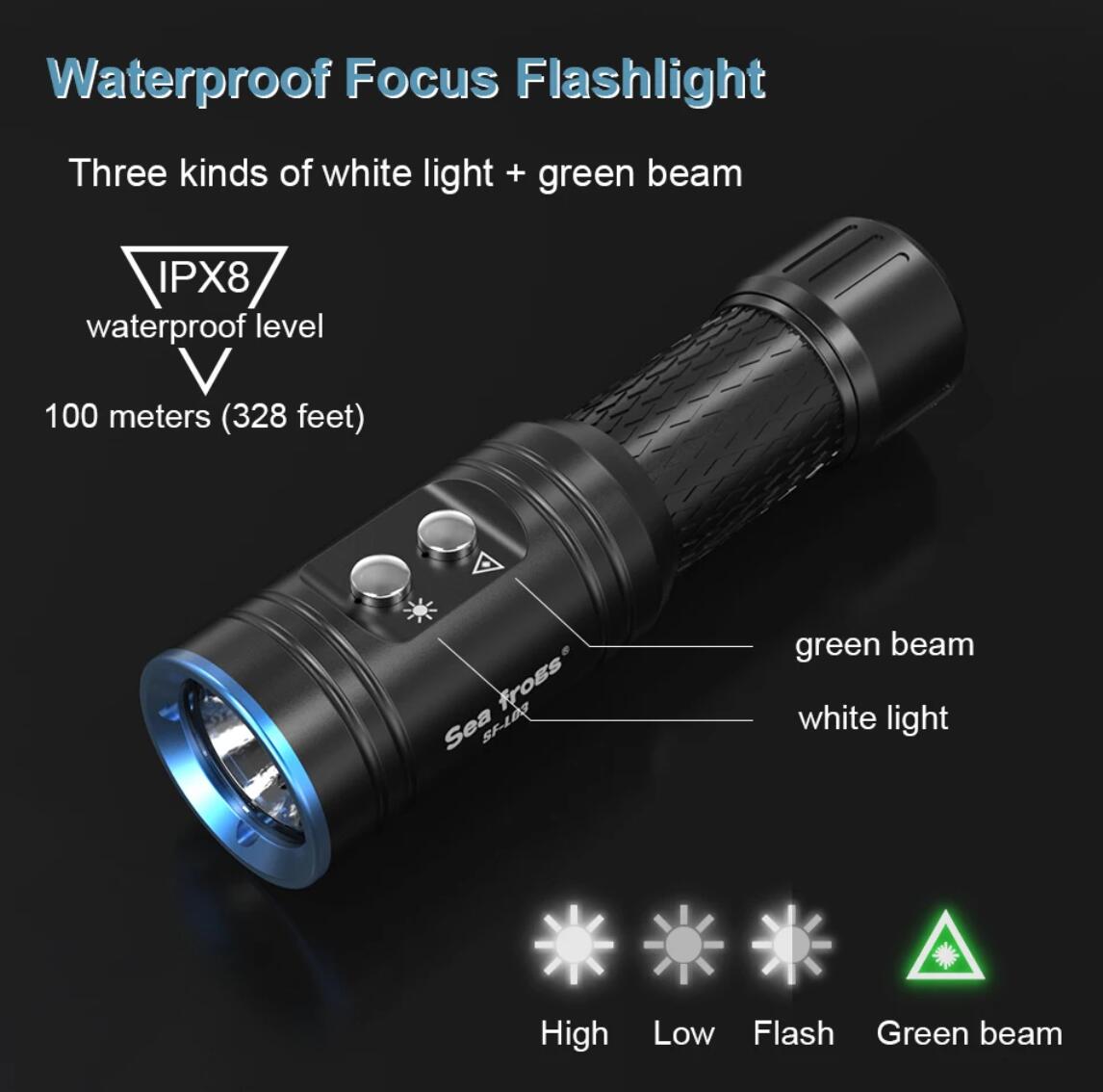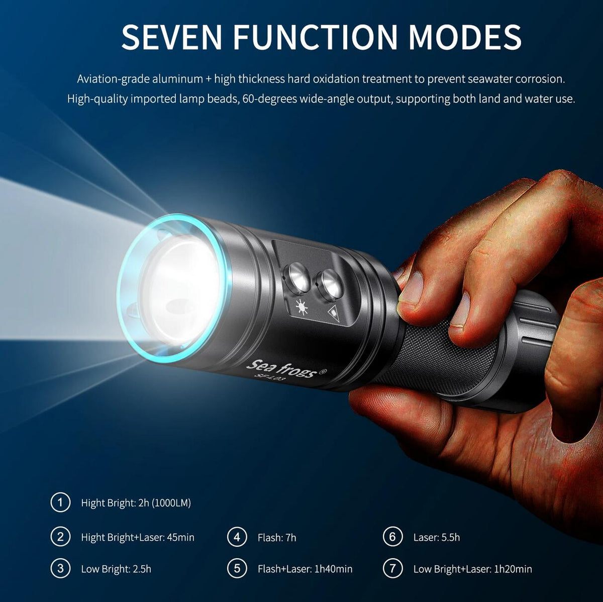 Sea Frogs Scuba Diving Light 1000 Lumen 100 Meter Underwater Flashlight With Green Laser