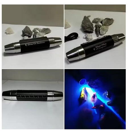 This 3 in 1 Ultraviolet Flashlight emits 254nm UV light, 365nm UV light and 395nm UV light for fluorescent minerals detection and Shortwave 254nm UVC light producing brilliant fluorescent response for some gemstone minerals within the illuminated area. Longwave 365nm and 395nm UV light mainly used for banknotes, stamps, ID cards, invoice, passports etc detection, It is a beneficial tool for experts, collectors, enthusiasts.