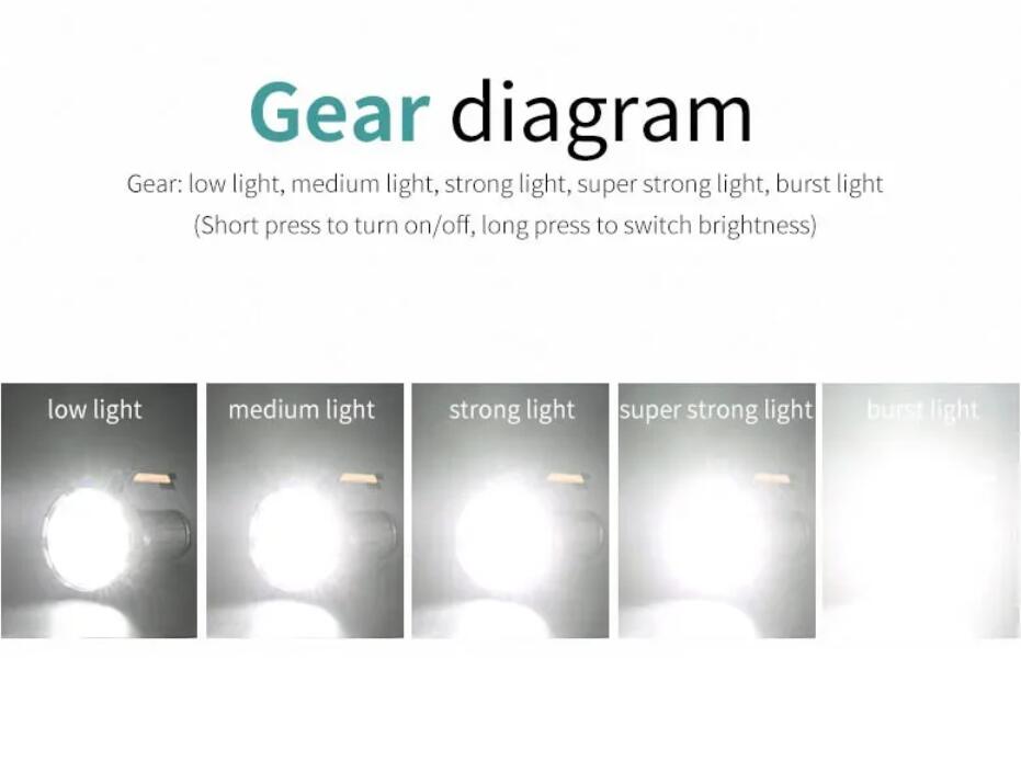 5.【Handle Design】 the flashlight as a professional powerful flashlight, with a handle that you can use it anytime. And it has 6 lighting modes for different environments, Click to turn on, press and hold for 2 seconds to toggle: slightly light -medium light - high light -extra bright, Under bright light double-click to turn on : extremely bright - burst flash