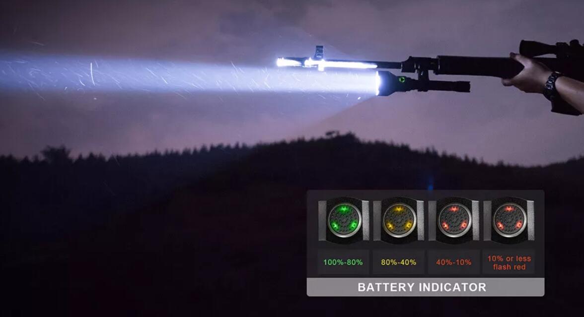 There is battery indicator light on the side switch, it will light up when the flashlight is on. Four different colors represent different remaining battery power, You can always know your power left through the battery indicator