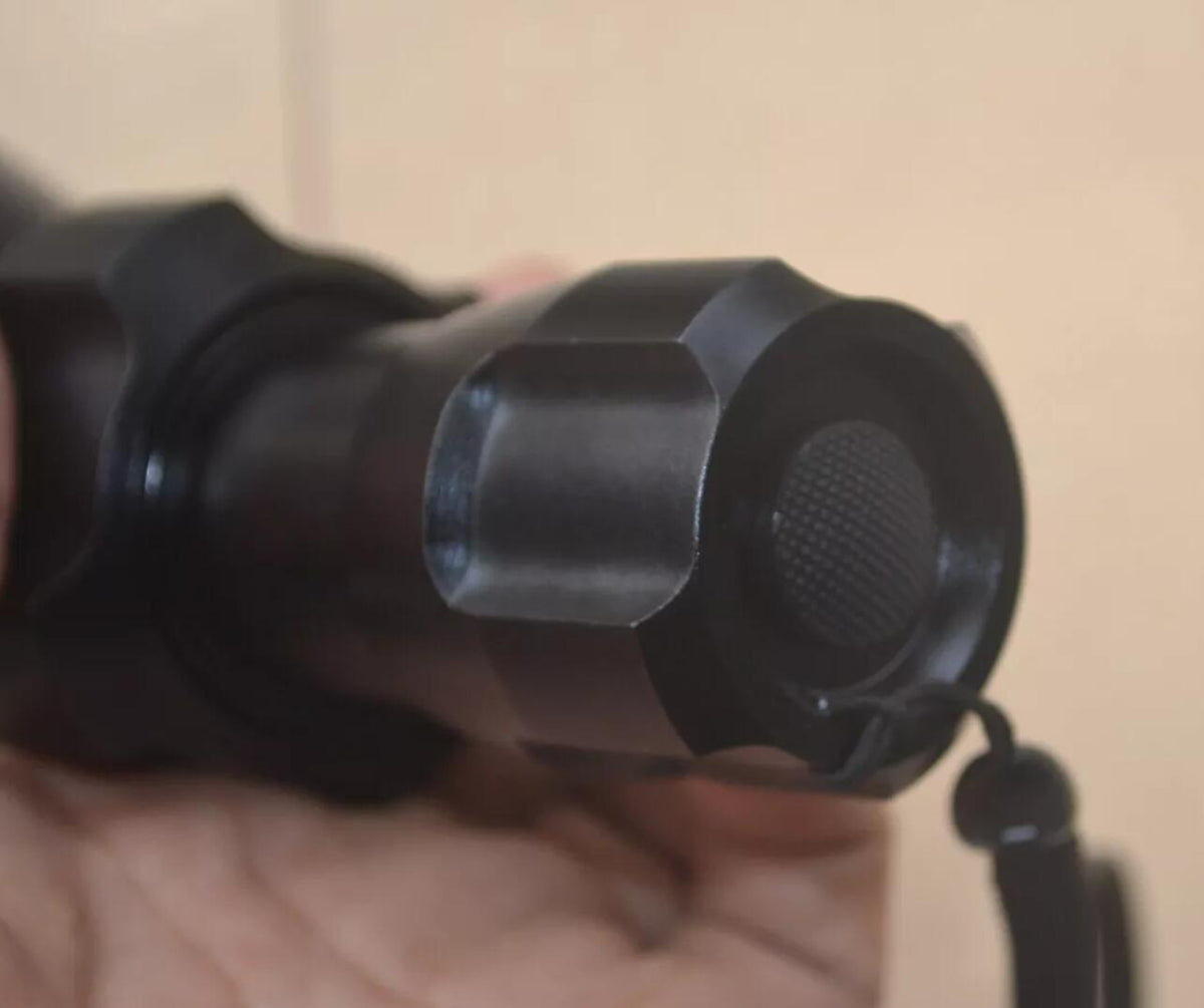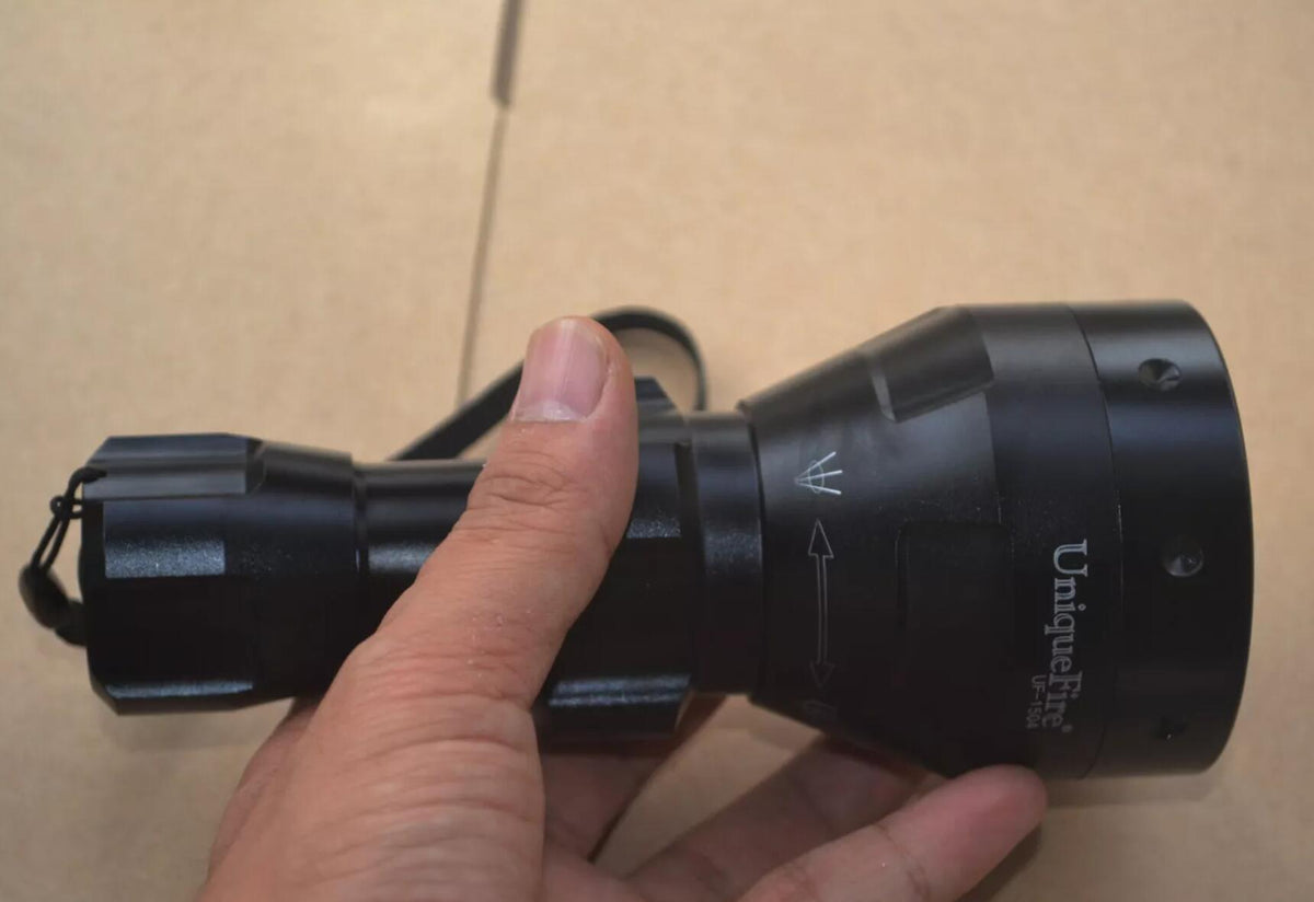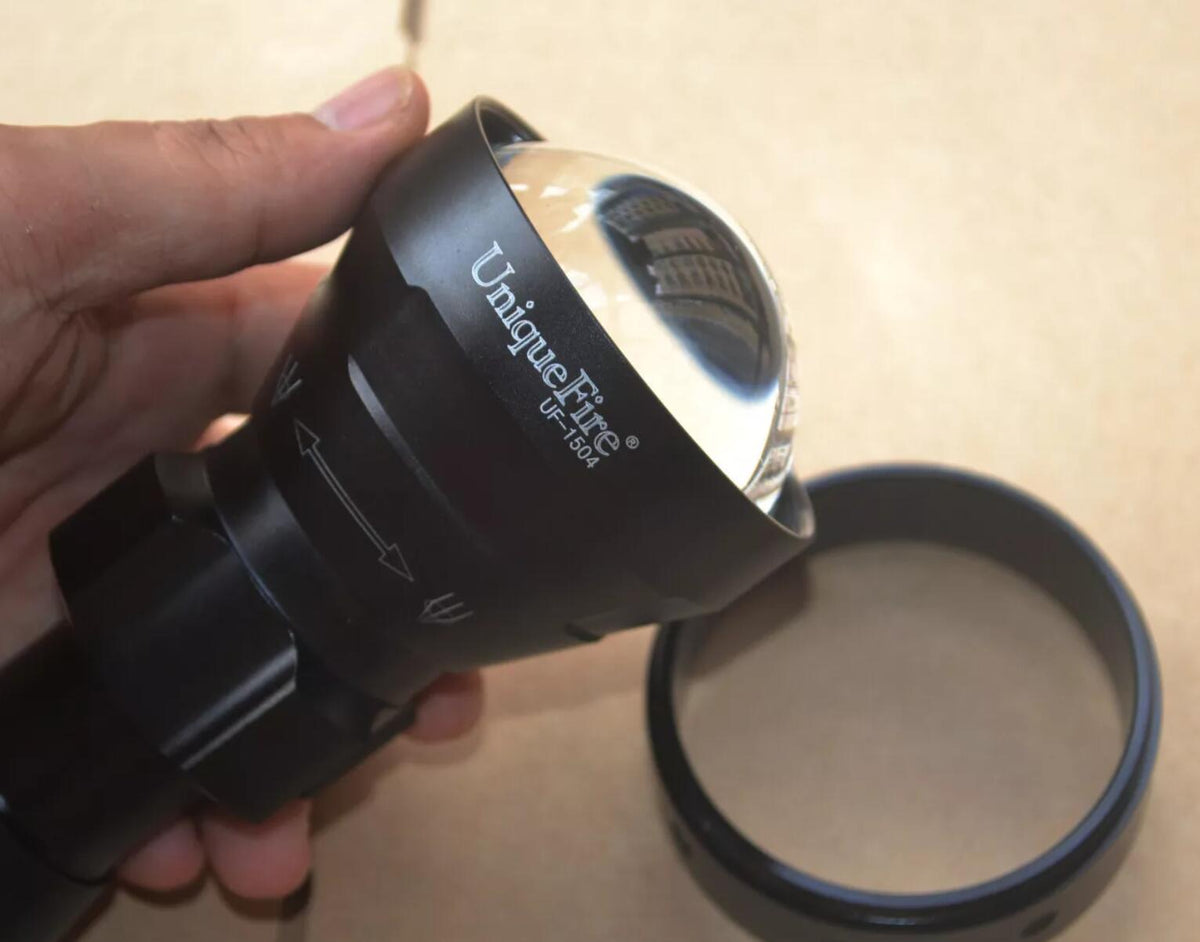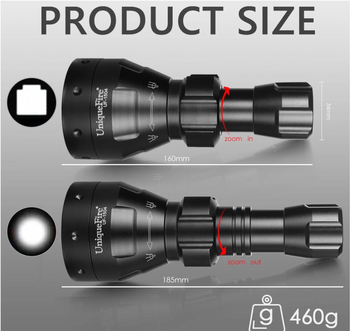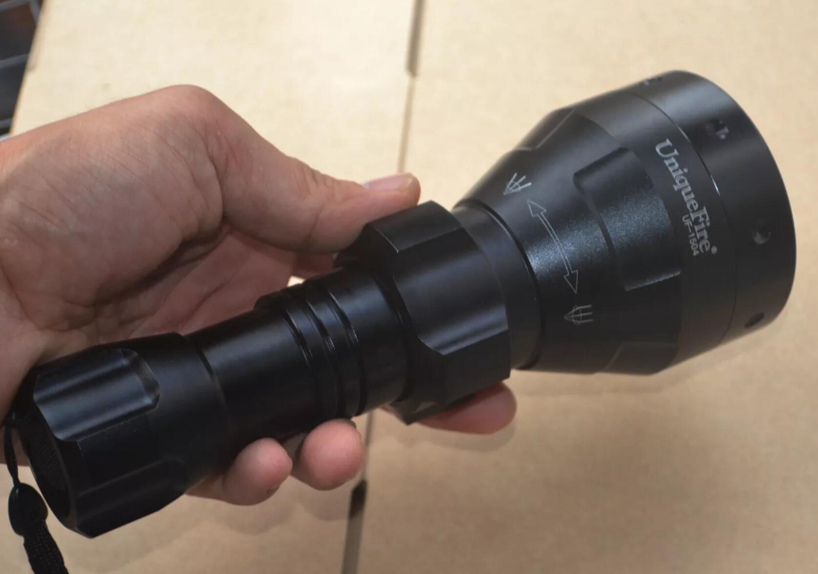UF1504 flashlight has an adjustable focus from spot to flood. This adjustable focus is achieved by screwing the head (rather than push/pull) so the torch is more resistant to recoil on heavy rifle calibers if mounted on a frearm.