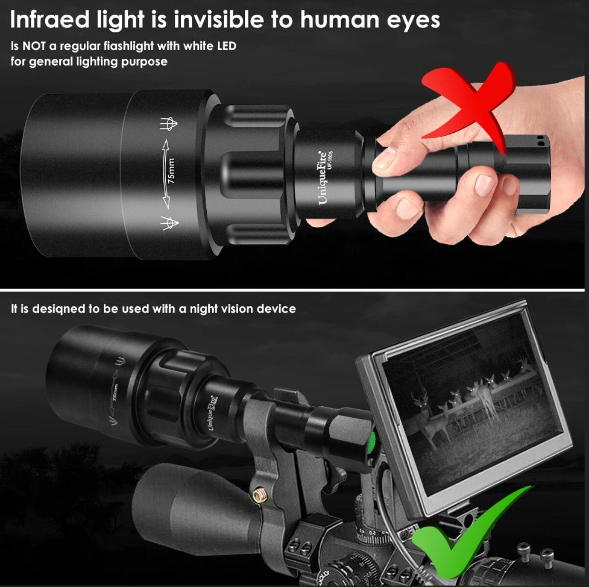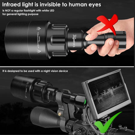 CAUTION:Infrared light is invisible to human eyes. It is designed to be used with night vision device.Only a Small and Faint Red Glow on the LED to Show You That the Torch is On.