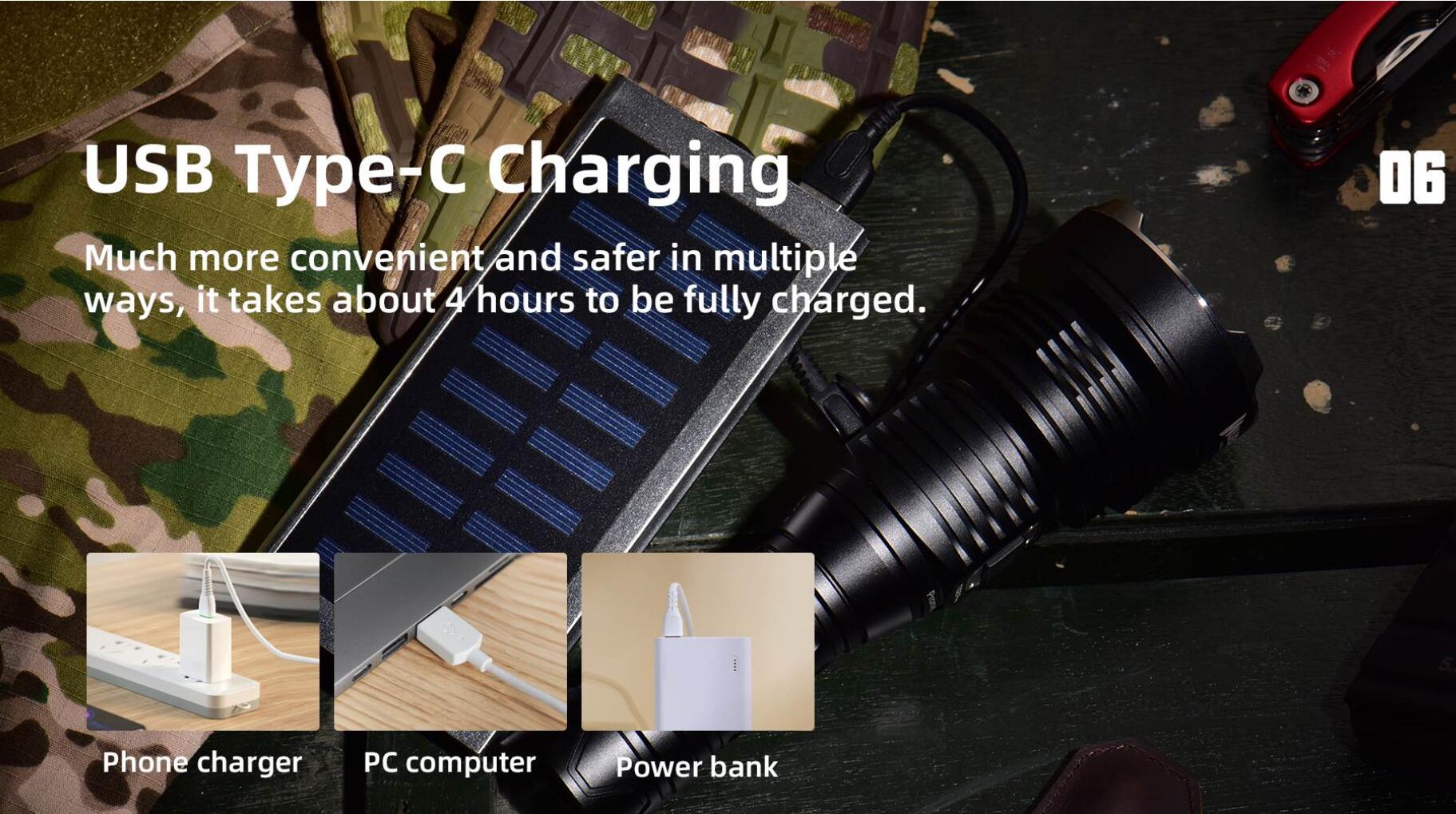 Long Runtime: Powered by a Type-C rechargeable battery(5000mAh), T102 pro has a run time up to 240 hours, the flashlight can be fully charged in 4 hours.